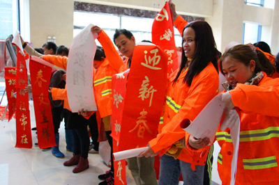“春滿人間百花吐艷 福臨小院四季常安” “一帆風(fēng)順年年好 萬事如意步步高” ……126日至28日,麗匯大廈一樓熱鬧非凡,為了感激社會各界對綠港集團的關(guān)心與支持,由綠港集團工會組織的書法家“迎新春 送祝?!绷x務(wù)送春聯(lián)活動吸引了大量前來求墨寶的社會各界人士。三位南寧市書法協(xié)會的書法家以及南寧科巨公司副總經(jīng)理陸章發(fā)為觀眾們現(xiàn)場揮毫,一幅幅金燙燙、散發(fā)著墨香的春聯(lián)映襯著人們的笑臉,整個現(xiàn)場彌漫著濃濃的年味,短短三天時間便送出了2000多副春聯(lián)。126日上午,綠港集團工會還啟動了派送春聯(lián)儀式,綠港集團工會主席黃麗琴帶領(lǐng)工會人員將春聯(lián)送到經(jīng)開區(qū)40余位保潔人員、園林綠化工人、公司職工的手上。(張彩秀/文、圖)