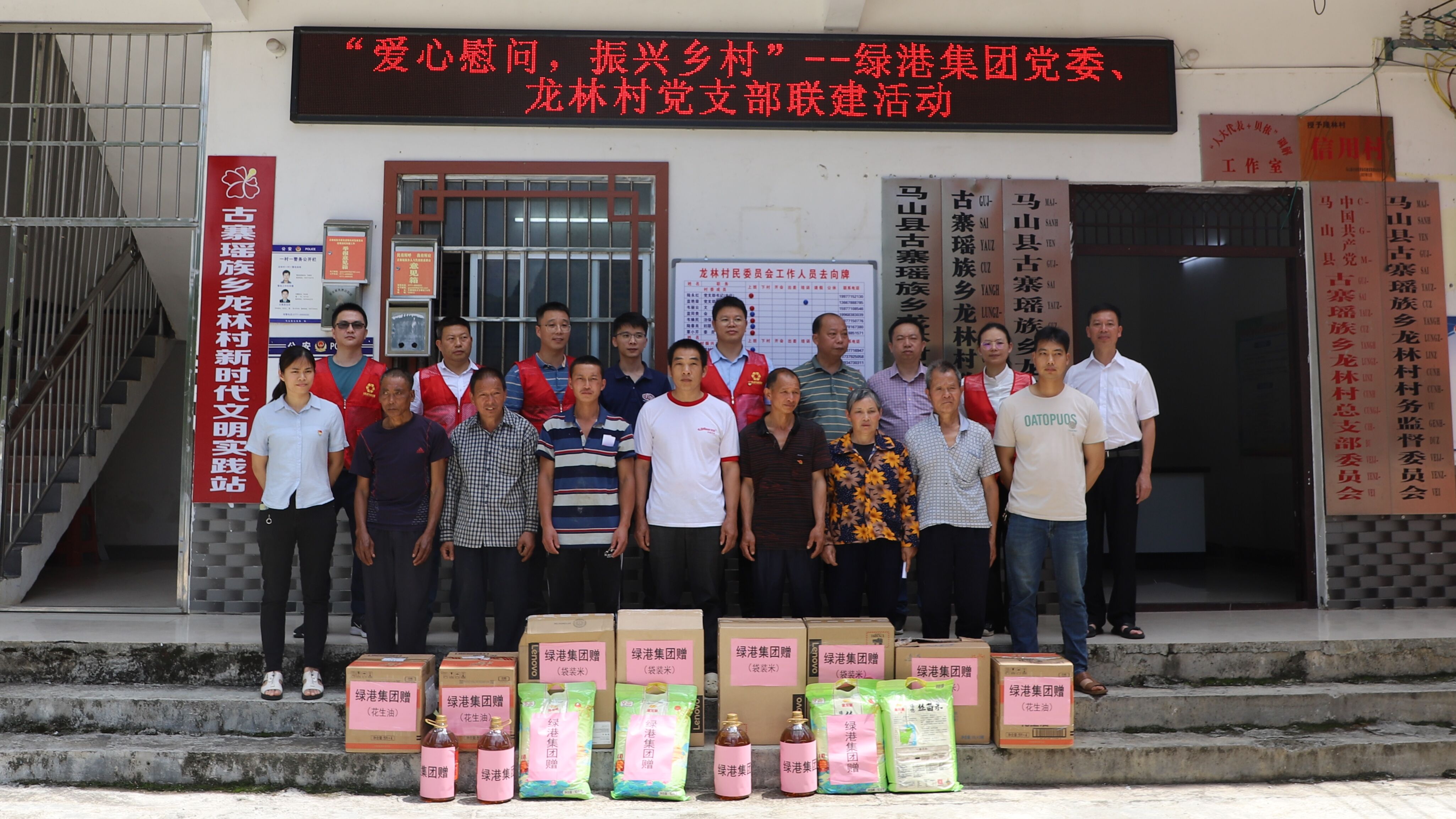 5月29日,綠港集團黨委副書記、總經(jīng)理鄧繼慧,黨委委員、副總經(jīng)理陸羿冰,黨委委員、副總經(jīng)理陽正輝,以及集團黨委辦和萬方公司黨支部的部分同志代表集團黨委,到對口幫扶的馬山縣古寨瑤族鄉(xiāng)龍林村開展村企聯(lián)建慰問活動。綠港集團派駐龍林村第一書記梁華以及龍林村干部、駐村工作隊員一起參加了活動。