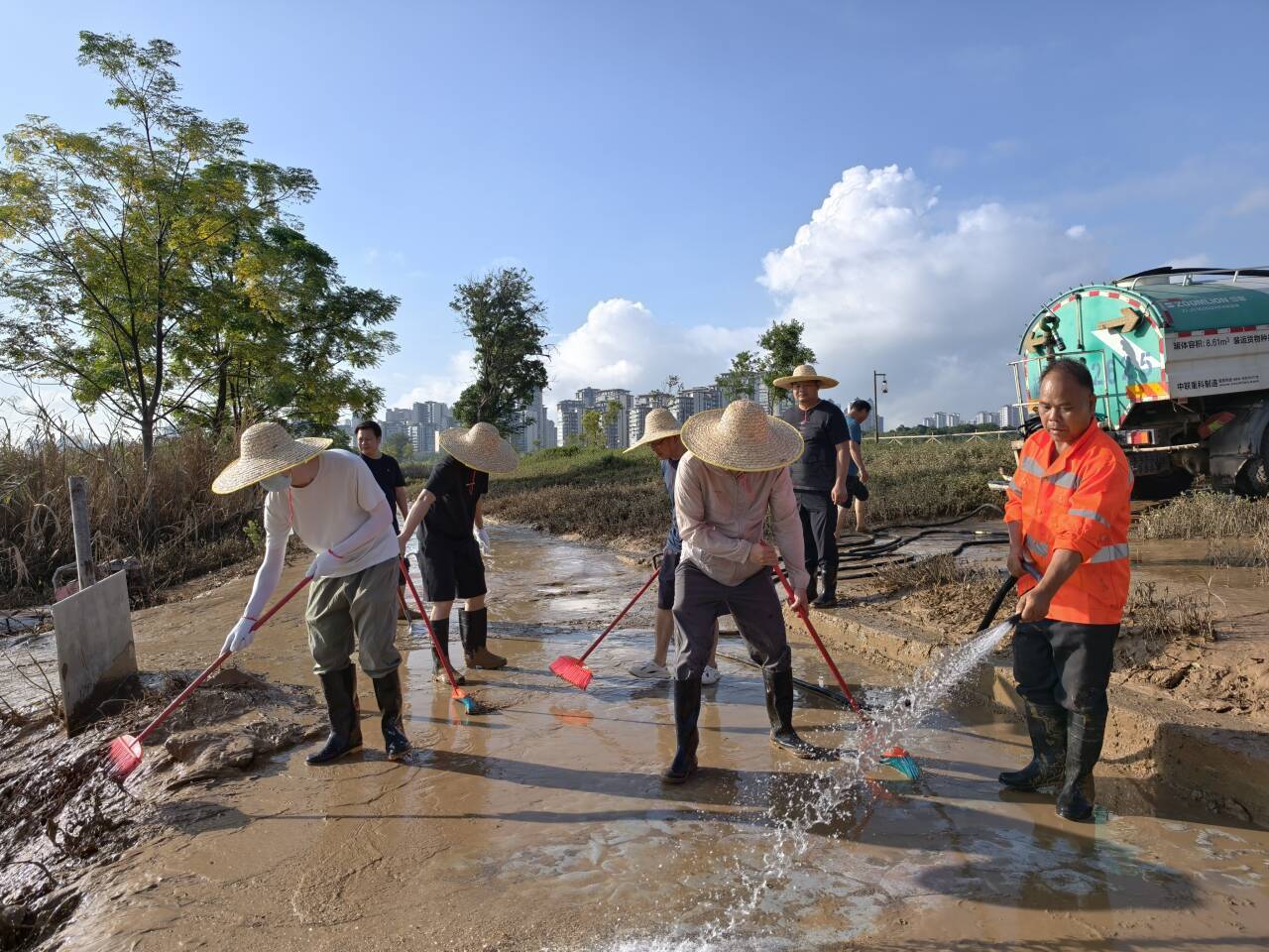 上午8點,志愿者們攜帶鐵鏟、刮泥板、掃帚、垃圾袋等工具,準(zhǔn)時在指定區(qū)域集合?,F(xiàn)場的淤泥最深處達(dá)10余厘米,腳一踩便陷進去難以拔出,鏟子剛插進泥里就被牢牢黏住?!按蠹曳止じ桑裙伪韺幽?,再清垃圾!” 隨著一聲號召,志愿者們迅速分組行動:有的彎腰緊握刮泥板,順著步道紋理反復(fù)刮除黏連的淤泥;有的扛著水管,利用高壓水槍沖刷地面;有的拎著垃圾袋,蹲下身細(xì)致?lián)焓安卦诓菘p里的垃圾;有的則推著清運車,來回穿梭將裝滿淤泥和垃圾的袋子及時運離現(xiàn)場…… 各個環(huán)節(jié)銜接緊密、井然有序。盡管天氣炎熱,汗水順著臉頰滑落、浸透衣衫,志愿者們的熱情與干勁絲毫未減,充分展現(xiàn)了國企的責(zé)任與擔(dān)當(dāng)。