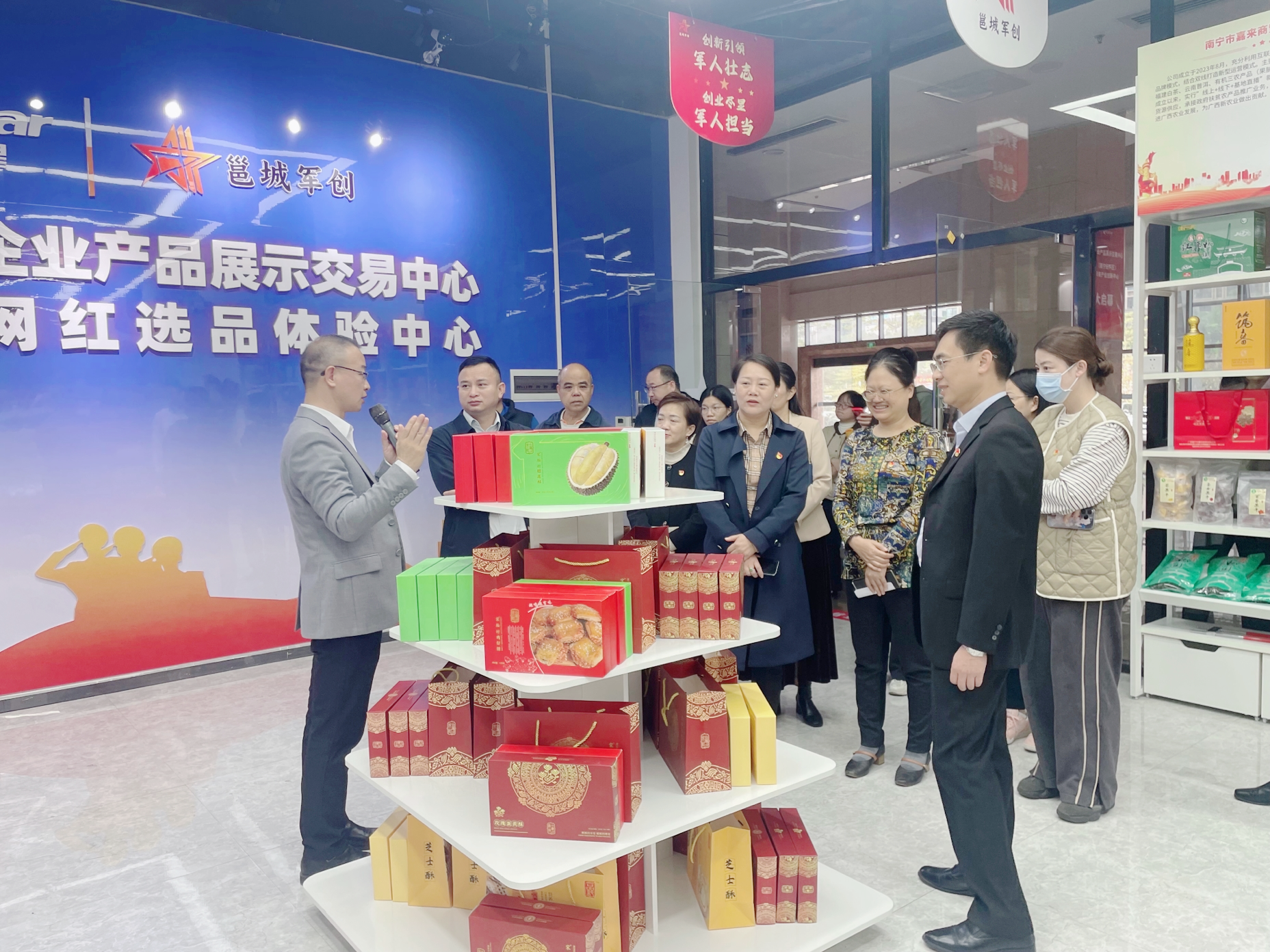 隨后,全體人員共同參觀了綠港金凱未來產(chǎn)業(yè)創(chuàng)新中心,黨建基地、企業(yè)文化建設(shè)長(zhǎng)廊、軍創(chuàng)會(huì)客廳、直播電商網(wǎng)紅選品體驗(yàn)中心,了解了孵化環(huán)境、孵化成果、基地幫扶等情況,并圍繞企業(yè)生產(chǎn)情況、產(chǎn)業(yè)定位及發(fā)展前景等方面進(jìn)行座談分享。