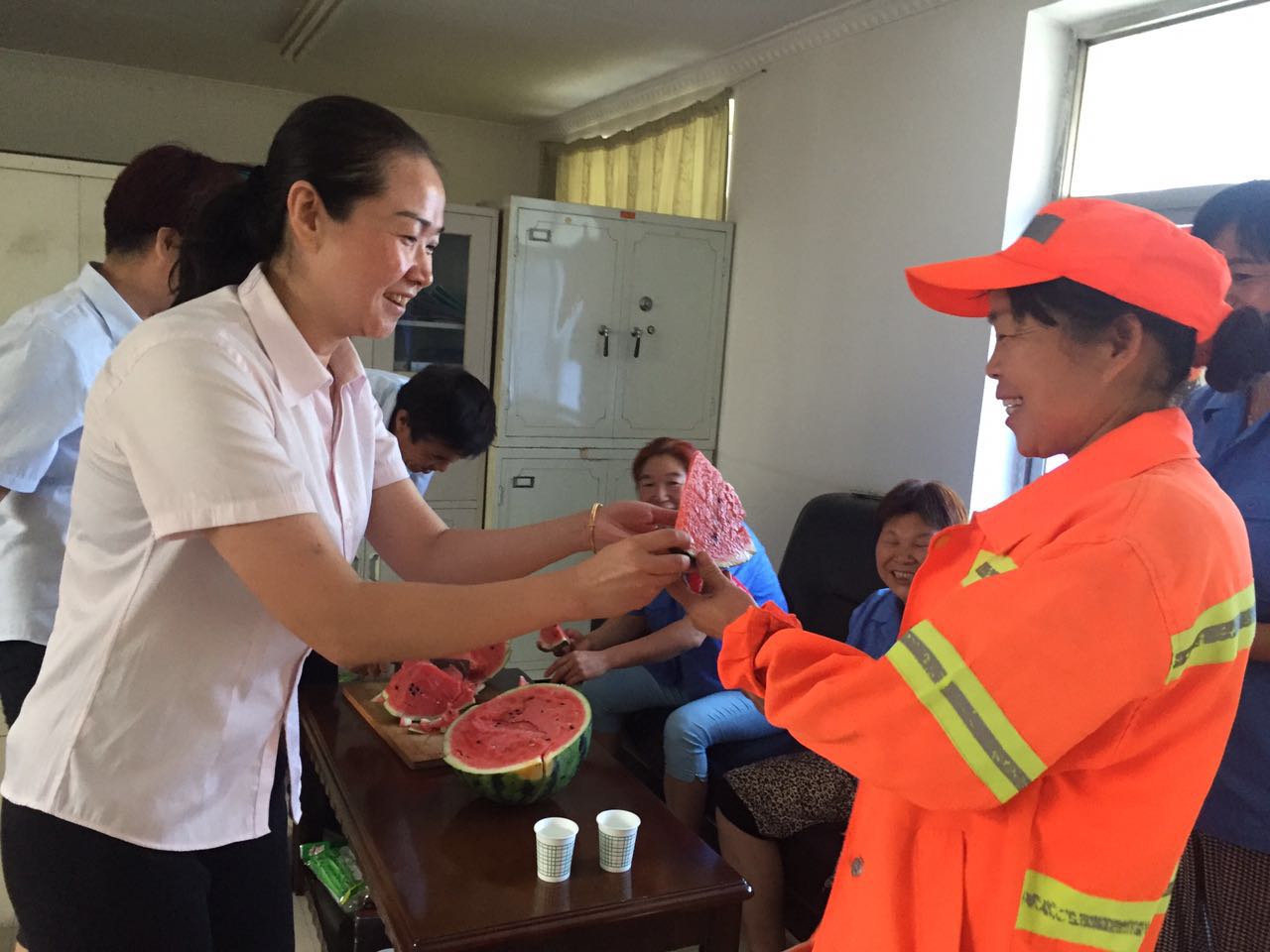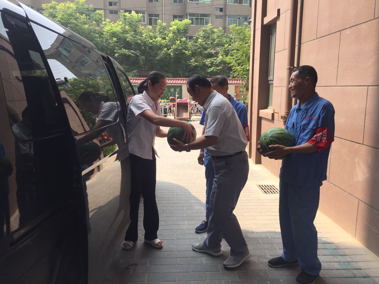 當日上午,總經(jīng)理趙明海、工會主席常紅艷等人一行來到河南街、安谷苑、九冶、城投時代進行慰問,向一線職工送去800余斤西瓜。慰問組每到一處,親切詢問保安保潔的生活情況和工作狀況,叮囑他們要注意防暑降溫,并對保安保潔近期以來的勤懇勞動表示感激和關(guān)懷之情,叮囑他們在開展“創(chuàng)文”整治工作以來,保潔員隊伍人員少、天氣熱、任務(wù)重的情況下,在提高小區(qū)環(huán)境質(zhì)量的同時,要做好遮陽等保護措施,注意勞逸結(jié)合,預(yù)防中暑。