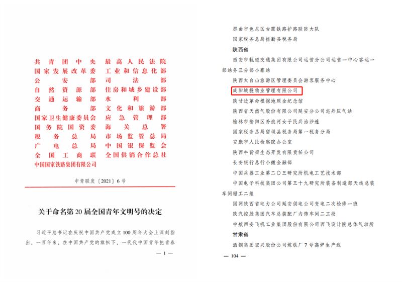 在2019—2020年度全國青年文明號創(chuàng)建評選中,咸陽城投物業(yè)管理有限公司憑借堅定的政治素質(zhì)、良好的職業(yè)道德、專業(yè)的職業(yè)技能、過硬的工作作風、優(yōu)秀的崗位業(yè)績獲得“第20屆全國青年文明號”榮譽稱號!